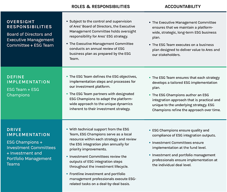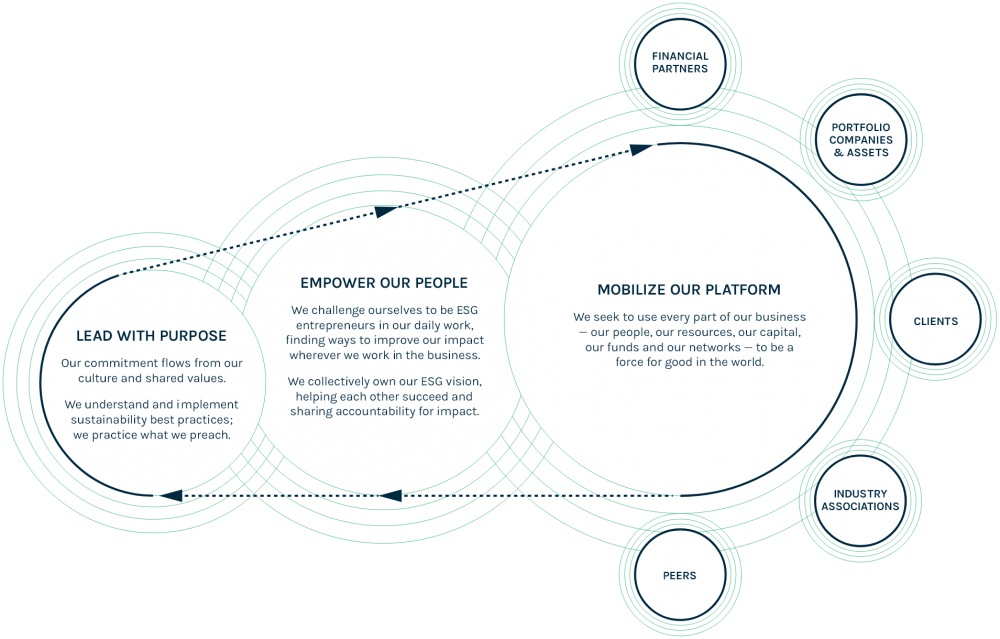 Board of Directors, Executive Management Committee, ESG Team, the groups of ESG Champions embedded in each investment strategy as well as the front-line investment and portfolio management professionals. Through this model, we collaborate firm-wide to tailor our ESG strategy to each investment group and drive ownership and accountability across the platform.